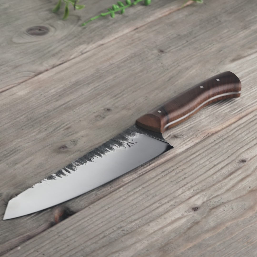 Die Klinge des Kochmessers besteht aus hochwertigem Kohlenstoffstahl, der für eine langanhaltende, rasiermesserscharfe Schneide sorgt. Der Griff ist so konzipiert dass er perfekt in der Hand liegt und durch die Leichtigkeit des Messers lässt es sich perfekt führen.
