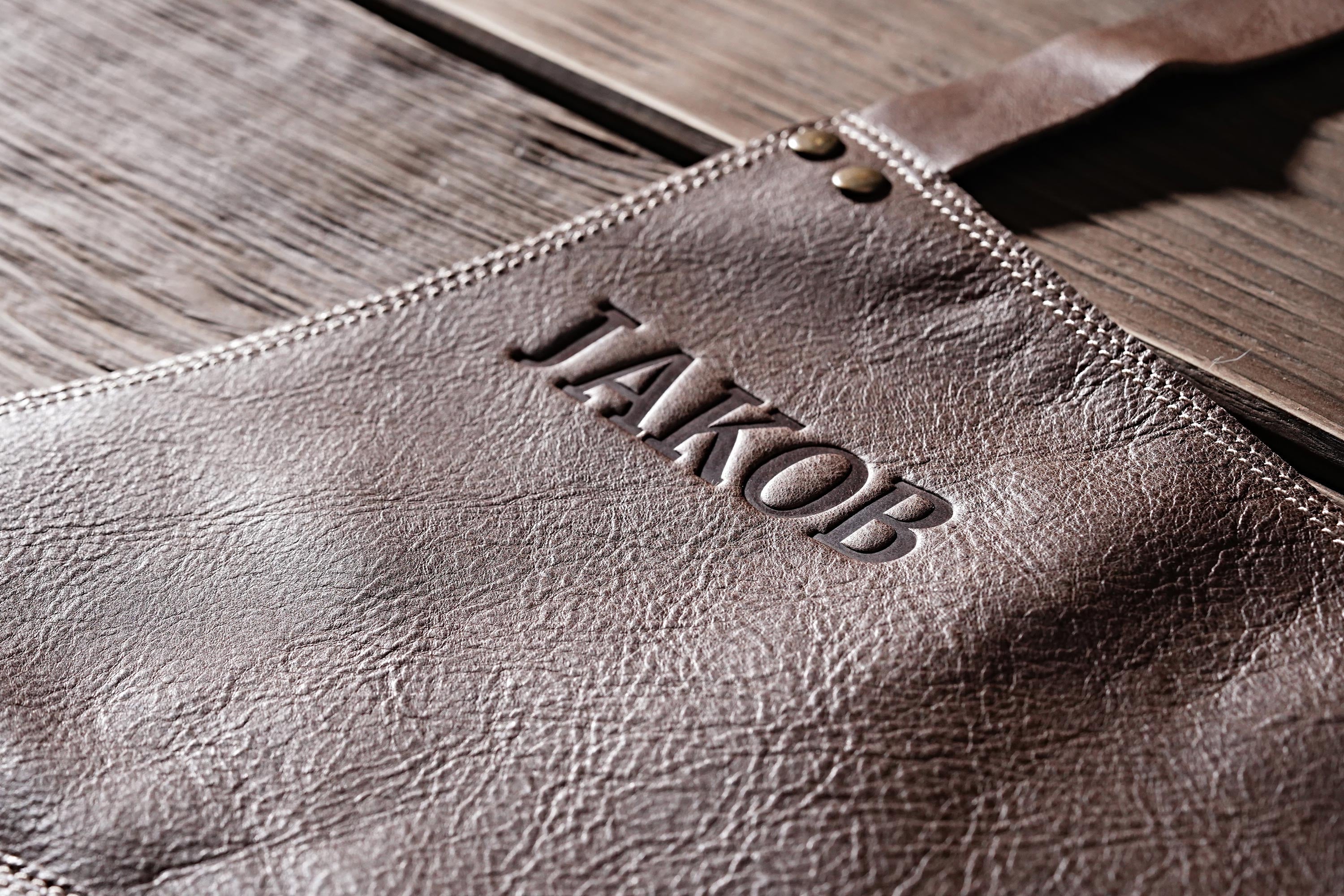 We press a custom metal stamp into the leather at high temperature, subtly altering the colour and creating a permanent, clean impression. Even the embossed areas remain easy to wipe clean, as the leather surface is not damaged during the process.